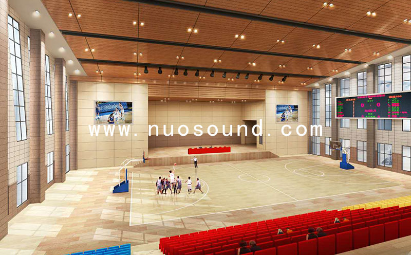 一般来说,多功能体育馆建筑声学设计的基本要求是要达到足够的响度、满意的清晰度、全场有比较均匀的效果以及无回声干扰等物理缺陷,除了基本的设计之外,吸音材料的选择也很重要。诺声声学向校方推荐的产品是诺声体育馆孔木吸音板。