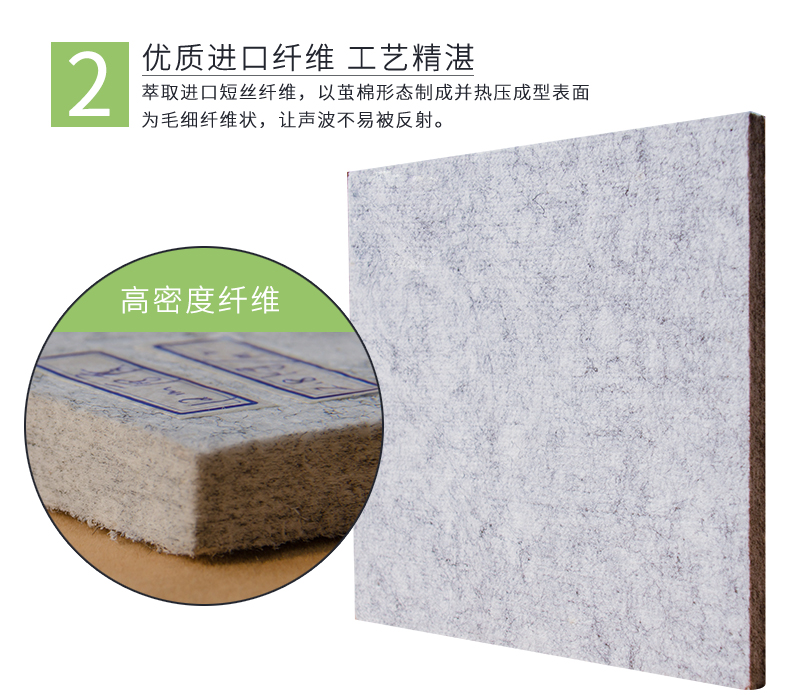 2、优质进口纤维,工艺精湛,萃取进口短丝纤维,以茧棉形态制成并热压成型,表面为毛细纤维状,让声波不易被反射。