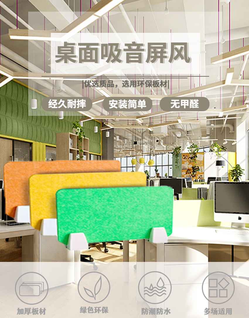 诺声桌面吸音屏风是采用聚酯纤维经高温技术热压并以茧棉形状组成,在中高频范围内具有良好的吸音性能,且达国家B1级防火要求,桌面吸音屏风采用远小于国家规定甲醛释放量的绿色板材,可代替以往的玻璃纤维等材料,且可循环再用,符合直接用于室内装潢。